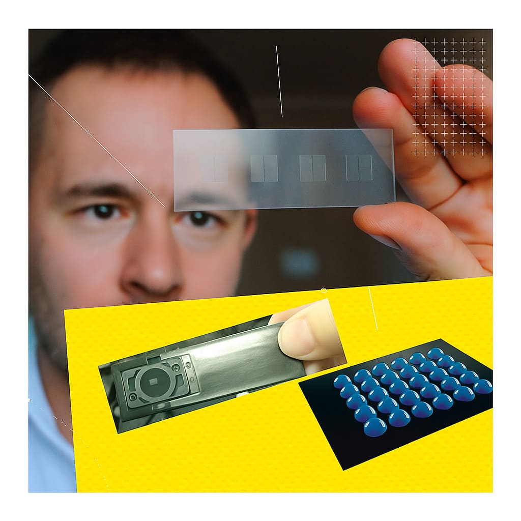 Порівняйте біочип із комп’ютерним процесором. Якщо звичайний чип містить мільйони транзисторів на крихітній площі, то біочип має до кількох тисяч мікроскопічних «плям» з іммобілізованим біологічним матеріалом — антитілами, фрагментами ДНК, антигенами, ферментами чи іншими біомолекулами. Сучасні технології дозволяють розміщувати мікротести на скляних або пластикових платформах розміром усього кілька квадратних сантиметрів.